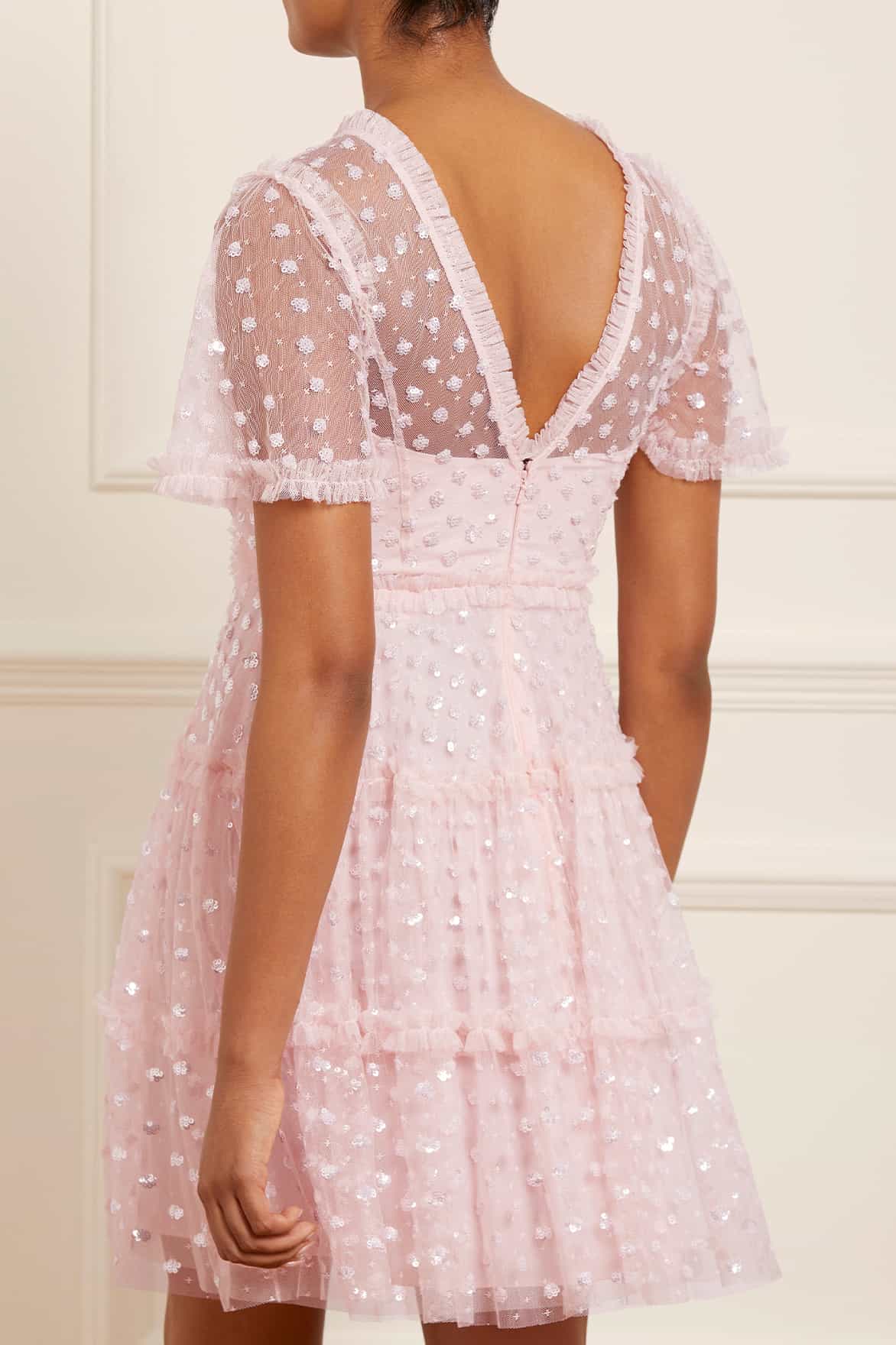 The Thea Mini Dress in Dusk Pink. This mini dress is scattered with polka dot sequin motifs to create an enchanting shimmer throughout. Developed with signature Needle & Thread 'x' motif tulle adding subtle detail. Make a special appearance in the Thea at your next event.
