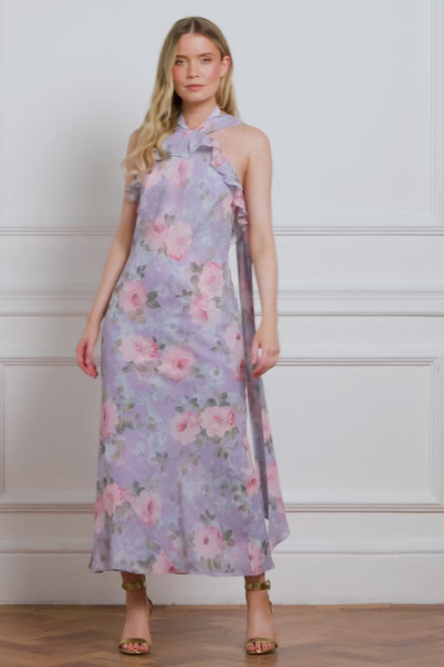 NEW SEASON. The Camille’s Garden Chiffon Halter-Neck Ankle Gown in Lavender. Showcases an archive-inspired floral print in soft pastel hues. Designed with a flattering halter neckline and a flowing chiffon skirt, this gown offers an effortlessly graceful silhouette, perfect for light spring and summer occasions.