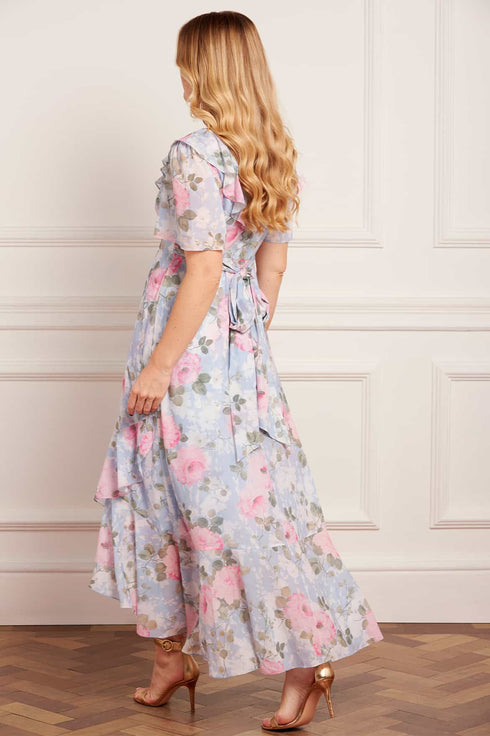 NEW SEASON | NEEDLE & THREAD EXCLUSIVE. The Camille’s Garden V-Neck Ankle Gown in Skylight. Adorned with delicate watercolour florals that evoke vintage artistry. Cut with a flattering V-neckline and soft chiffon layers, this gown feels light, feminine, and effortlessly elegant.