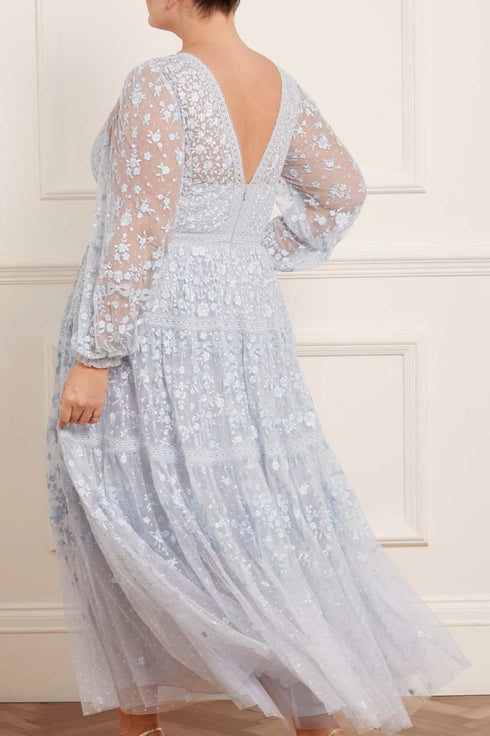 The Celestia Ribbon Gown in Blue. This gown has been intricately designed with rich embroidery inspired by vintage lace, featuring delicate floral motifs and ribbon bows throughout. Crafted with pretty lace trims for signature Needle & Thread detailing, and delicately constructed with a textured tulle fabric base. Featuring a V-shaped neckline and a new, ultra-flattering silhouette. Make the ultimate statement in the Celestia.