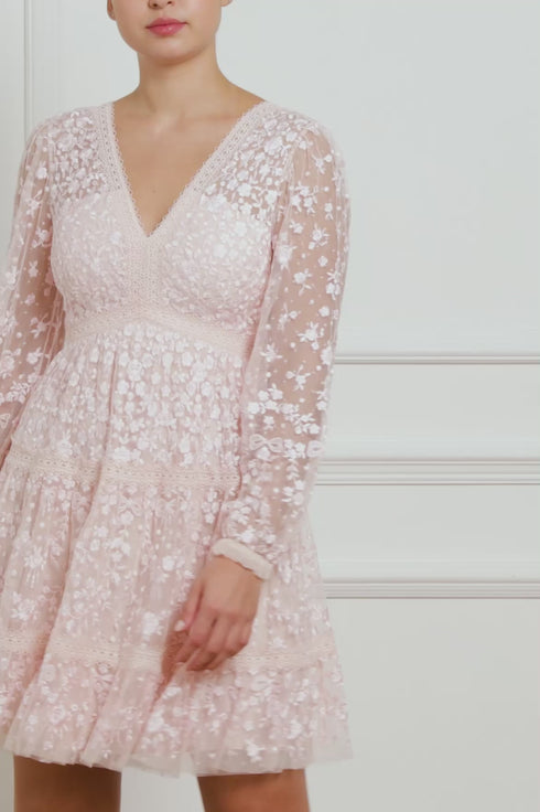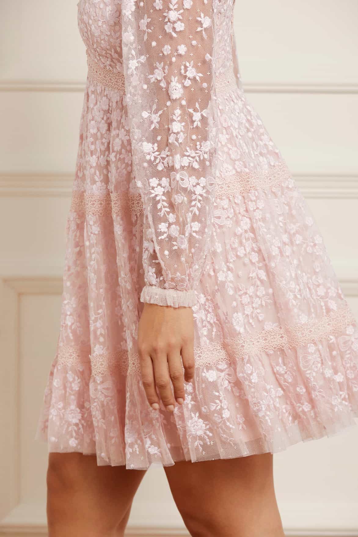 The Celestia Ribbon Mini Dress in Petal Pink / Pale Pink. This mini dress has been intricately designed with rich embroidery inspired by vintage lace, featuring delicate floral motifs and ribbon bows throughout. Crafted with pretty lace trims for signature Needle & Thread detailing, and delicately constructed with a textured tulle fabric base. Featuring a V-shaped neckline and a new, ultra-flattering silhouette. Make the ultimate statement in the Celestia.