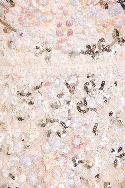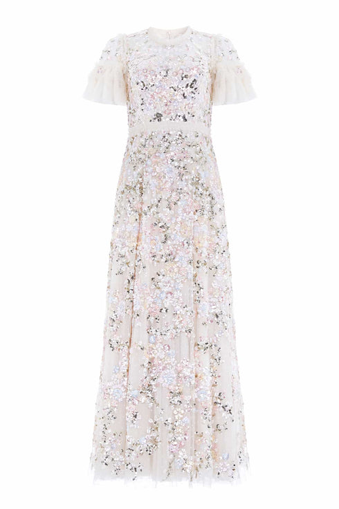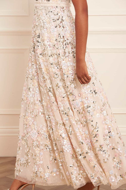 The Dream Garland Gloss Round Neck Gown in Cream. This embellished gown is beautifully scattered with high-shine sequins in a floral garland artwork inspired by an early 1900s illustration. Beautifully decorated with specially sourced ultra-shine sequins in pretty pastels. Developed with a generous, sweeping skirt made from layers of tulle and net to create a signature, statement look. The perfect style for an upcoming special occasion.