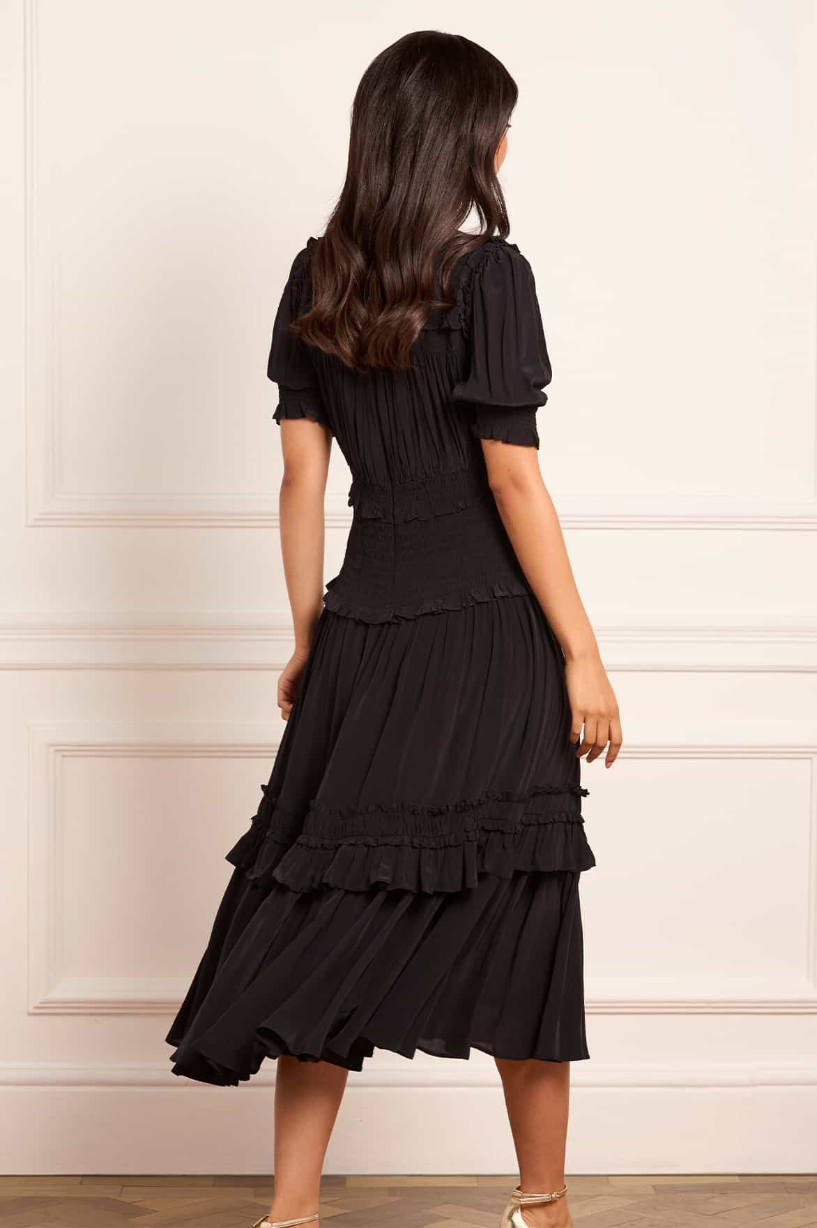 NEW SEASON | NEEDLE & THREAD EXCLUSIVE. The Emilia Crepe Ballerina Dress in Graphite. A versatile mid-length silhouette crafted in a soft matte crepe. This style features a gently fitted waist, soft draping at the neckline, and a flowing skirt for ease and movement. Perfect for sophisticated dressing or minimalist eveningwear.