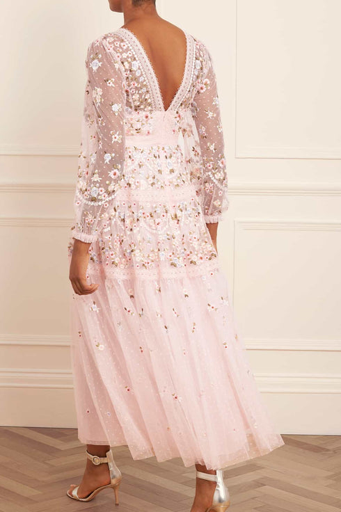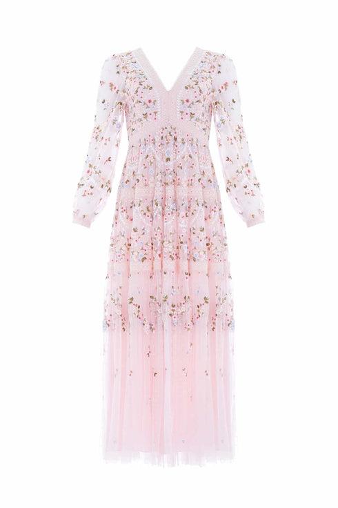 The Garland Ribbon Ankle Gown in Peony Pink. This embroidered gown is inspired by Victorian lace trims. Beautifully designed with floral embroidery in soft pastel tones. Developed with a V-shaped waist seam to create a flattering, effortless fit. This gown is adorned with intricate lace trims for signature Needle & Thread detailing. A pretty piece you'll forever treasure.