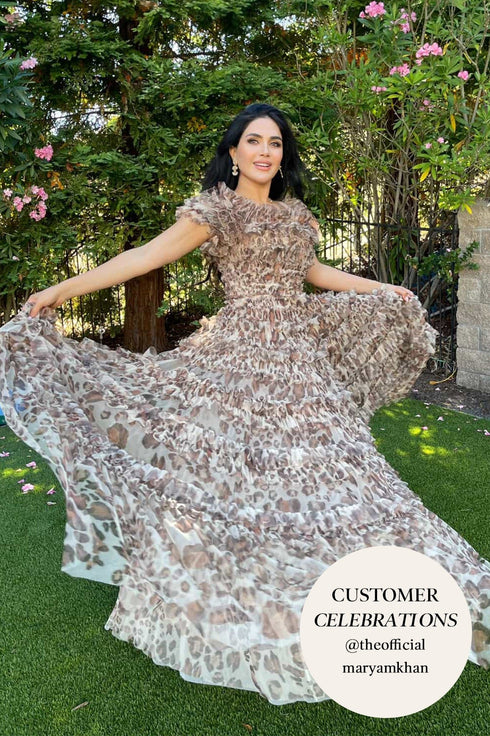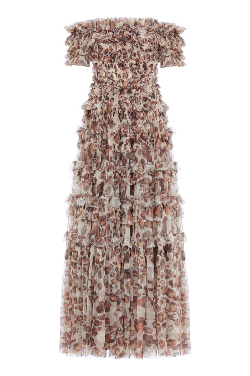 The Leopard Lisette Off-Shoulder Gown in Moonshine. This dress features a statement print that was hand-painted in-house using watercolour, with soft leopard motifs varying in scale and showcasing watery definition. This statement gown has an elegant off-the-shoulder design inspired by Hollywood styling. Crafted with textile tulle and double-stitched frills for a dramatic, romantic effect. Features an integrated corset for a perfect fit and to hold the silhouette. Expect all eyes on you in this romantic gown.