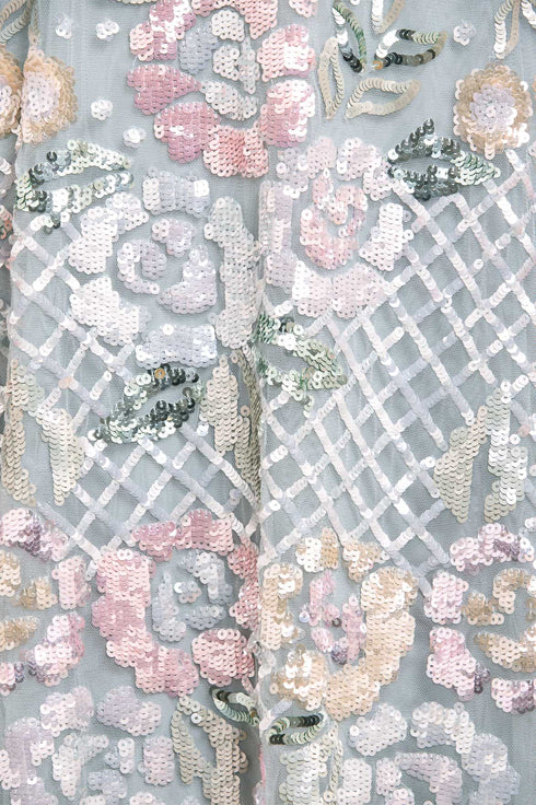 The Rosalie Ankle Gown in French Blue. This exquisite piece from Needle & Thread’s heritage collection is a masterclass in timeless elegance. The statement multicolour design is crafted from countless glittering sequins, artfully arranged in floral motifs within linear bands, accented with delicate dotted sequin and crosshatch details. Crafted with signature Needle & Thread tulle frills across the neckline and armholes, adding a touch of sophistication, while the blouson sleeves feature softly gathered elastic cuffs with refined frill edges. The skirt, composed of layers of luxurious soft tulle, flows effortlessly, creating a romantic and ethereal silhouette. This gown is the perfect embodiment of artistry, luxury, and timeless refinement.