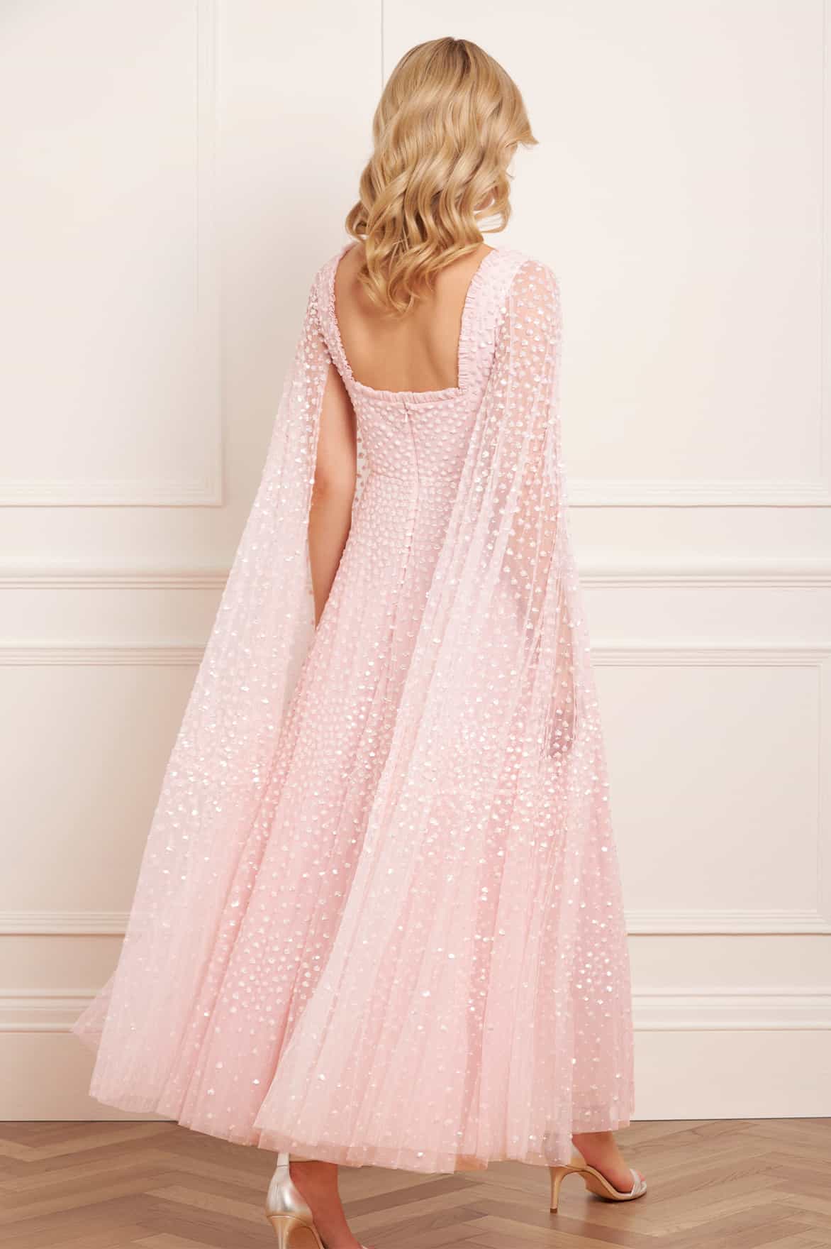 The Scatter Dot Cape Sleeve Ankle Gown in Dusk Pink. This embellished gown is decorated with exquisite shimmering dot motifs, undulating in wave formations for a captivating glittering effect. Designed with a sweeping floor-length cape for romantic detailing and a statement look. The flattering square neckline is trimmed with signature Needle & Thread tulle frills. The skirt is made up of generous layers of net and tulle with a sweeping hemline. The perfect choice for an upcoming special occasion and beyond.
