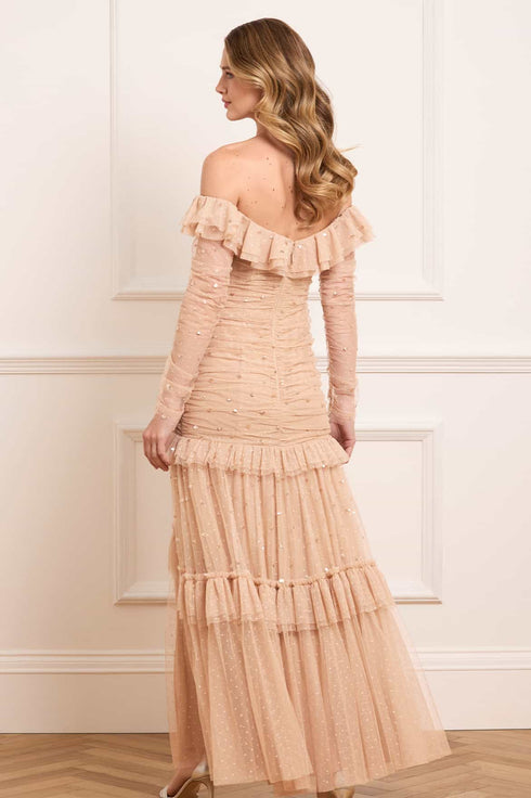 The Sequin Glimmer Rouched Off-Shoulder Gown in Butterscotch. Make an entrance in this showstopping gown, featuring an off-shoulder neckline adorned with cascading circle-cut frills that create a soft, romantic silhouette. Crafted with glittering sequin dot motifs, enhanced with a high-shine foil coating for an ultra-lustrous finish, which gently scatters down the layered tulle skirt, adding ethereal movement. The ruched bodice and sleeves flatter the figure, while the tiered skirt with topstitched gathered frills lends delicate depth and charm. An internal stretch power mesh corset provides structure, comfort, and support, detailed with soft boning encased in grosgrain ribbon and adjustable hook-and-eye fastenings for a refined, couture finish.