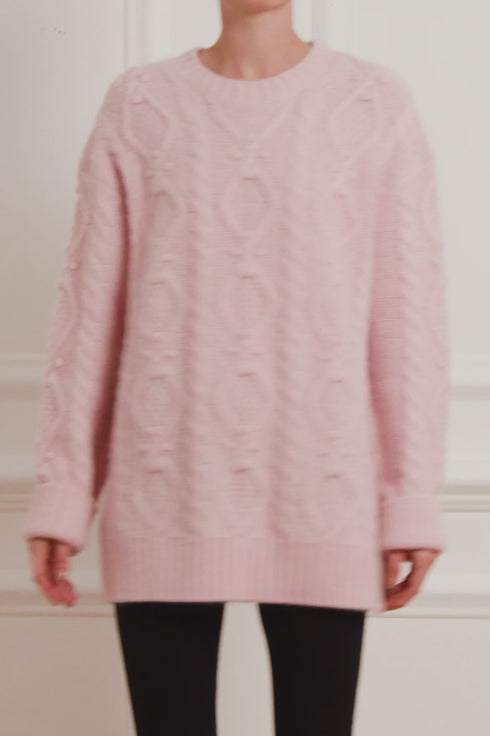 NEEDLE & THREAD EXCLUSIVE. The Sylvie Cable Longline Jumper in Light Pink. This premium knitwear piece is designed in a super-soft, fluffy alpaca-blend yarn. This cosy jumper is crafted with a mix of diamond-shaped cables and twists in an intricate textile. Adorned with playful flower bobbles adding a feminine texture. Designed with a relaxed fit, subtle split details and loose sleeves to create a cosy feel. The ultimate wardrobe staple this season.