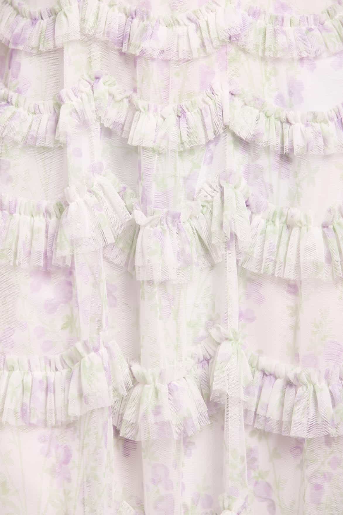 - Floral printed tulle decorated with layers of tulle ruffles.