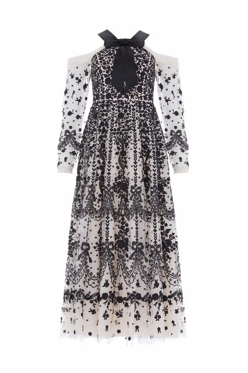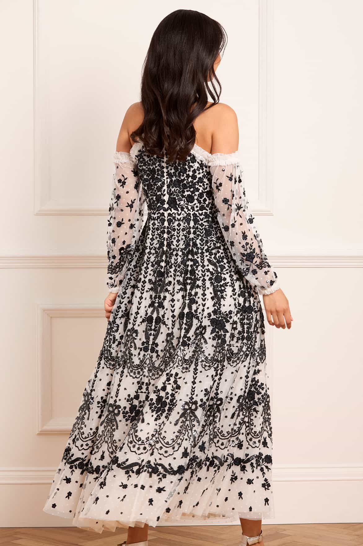 The Adeline Off-Shoulder Ankle Gown in Cream/Graphite. A dramatic take on evening elegance. Delicately embroidered with Victorian-era inspired florals, bows and scallops in contrast graphite thread, this off-shoulder silhouette embraces romance with a contemporary twist. Shimmering sequin embellishments enhance the flattering fitted bodice, while the ankle-length skirt flows into a cascade of softly glinting florals.