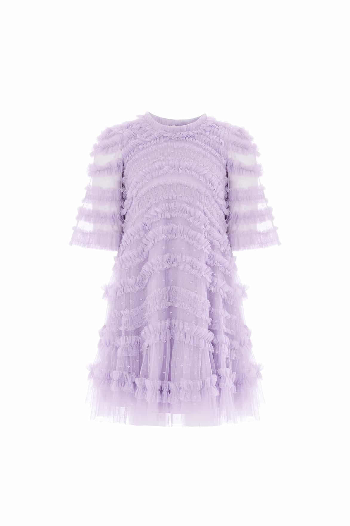 NEW SEASON. The Amara Ruffle Kids Dress in Lavender. Crafted from layers of soft tulle with signature Needle & Thread cascading ruffles. Designed for twirling moments, this dreamy dress brings playful elegance to special occasions.