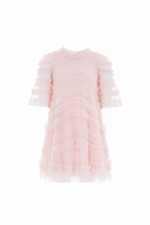 NEW SEASON. The Amara Ruffle Kids Dress in Seashell. Features gentle ruffle tiers that float beautifully with movement. Made from lightweight tulle, this enchanting style captures the magic of childhood celebrations.