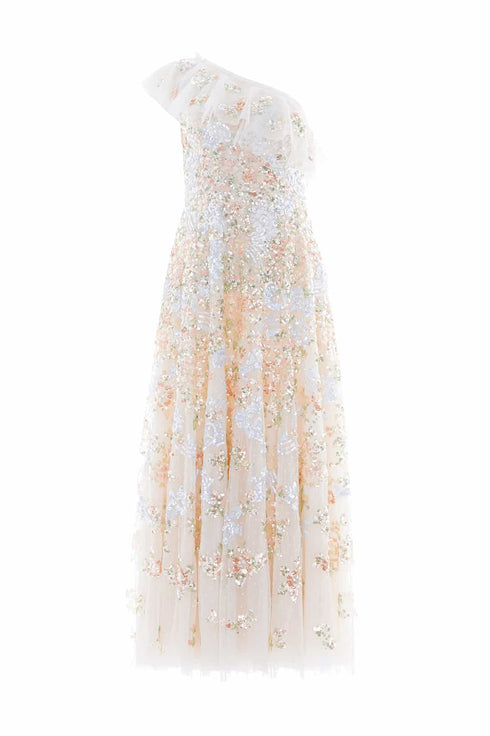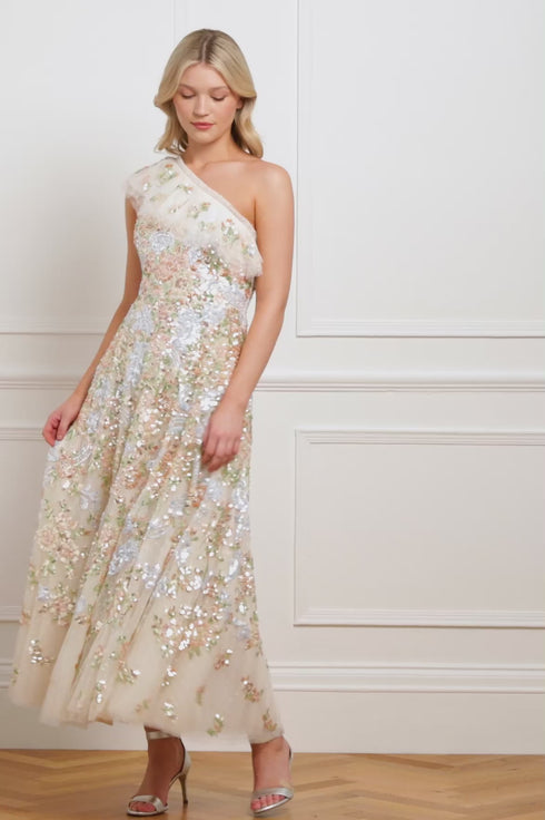 The Baroque Floral One-Shoulder Ankle Gown in Cream. A true statement piece for the season. This show-stopping silhouette features cascading layers of romantic, circle-cut tulle frills, artfully draped across a one-shoulder neckline. Designed with intricate baroque-inspired embroidery, with floral motifs and decorative scrolls. A voluminous skirt, crafted from generous layers of net and tulle, creates graceful movement and dramatic flair. An opulent blend of elegance and texture—perfect for your next unforgettable occasion.