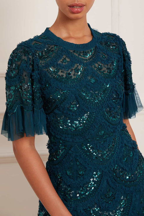 NEEDLE & THREAD EXCLUSIVE. The Carmen Ruffle Ankle Gown in Emerald. Designed with delicate tulle ruffles shaped into scallop sections, perfectly positioned to create a signature Needle & Thread romantic, textured look. This gown is beautifully embroidered with floral vine borders, featuring highlights of lustrous sequins for a glistening effect. A new wardrobe favourite.