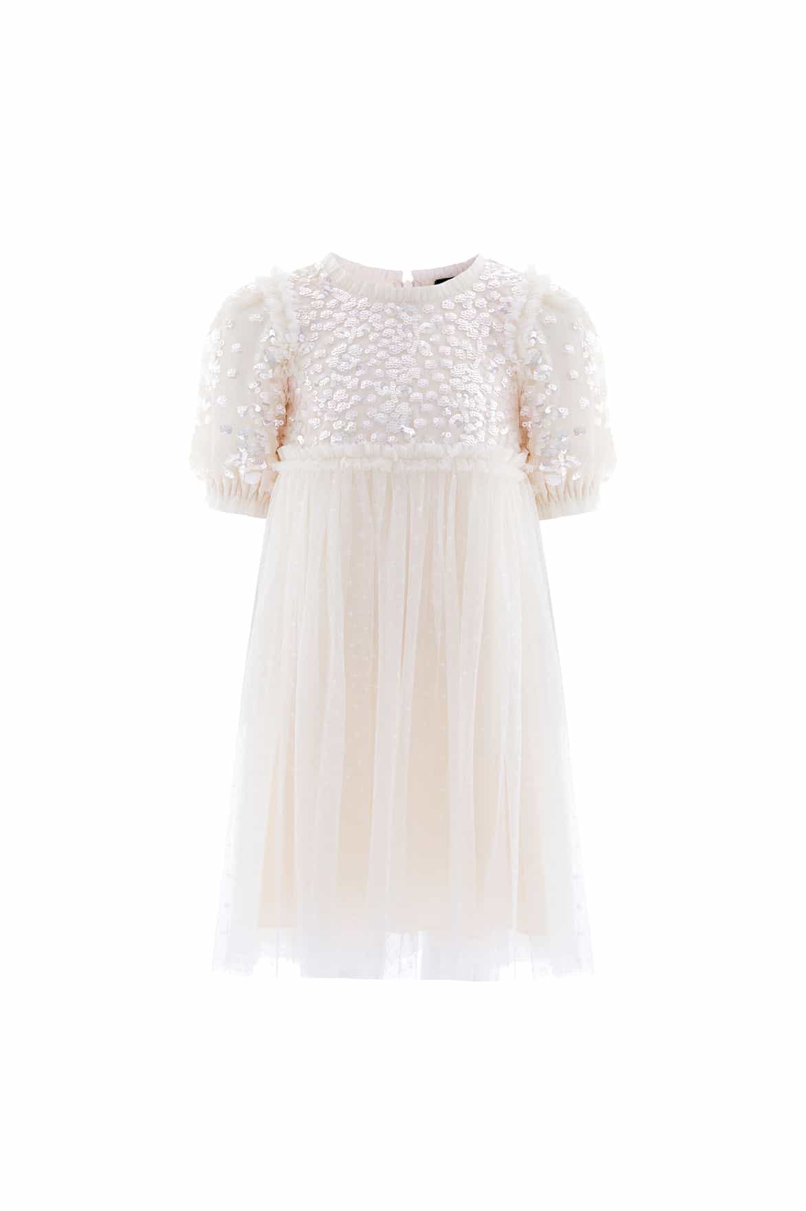 The Confetti Bodice KIDS Dress in Cream. This dreamy dress is full of sparkle and magic. The bodice is sprinkled with delicate sequin dots and sweet floral motifs, creating a fun confetti effect. The structured puff sleeves add a touch of princess drama, while the voluminous tulle skirt is made for endless twirls. Soft, signature Needle & Thread tulle frills decorate the neckline, shoulders, and waist, adding an extra sprinkle of fairytale charm to this playful and elegant dress.