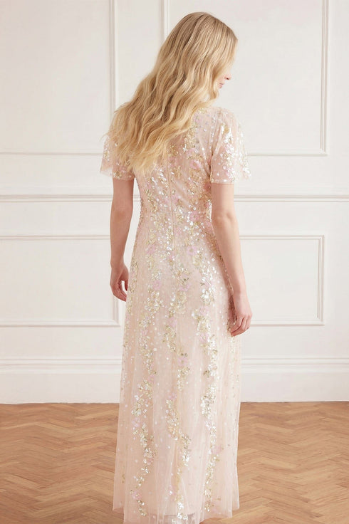 NEW SEASON. The Confetti Round Neck Ankle Gown in Cream/Multi. Beautifully embellished with scattered floral sequins inspired by falling petals, this gown creates a romantic, light-catching finish. The round neckline and flowing ankle-length silhouette offer timeless elegance for occasion dressing.
