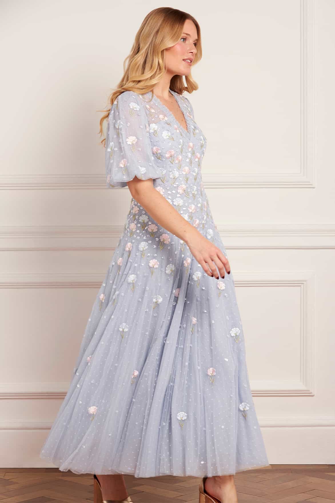 NEW SEASON. The Dandelion Ditsy Ankle Gown in Skylight. Showcases soft floral embroidery that gently fades toward the hem. Crafted from layers of fine tulle, this gown radiates lightness and romantic sophistication. A timeless evening statement.