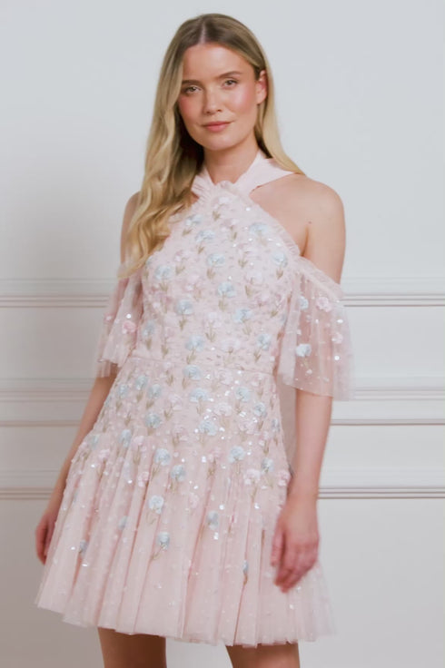 NEW SEASON. The Dandelion Ditsy Halter-Neck Micro Mini Dress in Seashell. Adorned with intricate embroidery and subtle shimmer. With its flattering halter neckline and playful mini length, this design brings a youthful, whimsical spirit to occasion dressing.