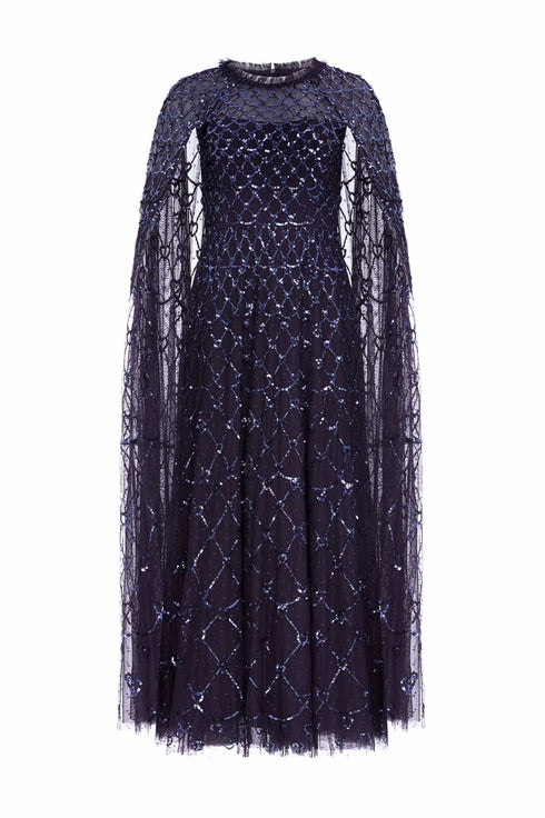 The Heart Lattice Ankle Gown in Midnight. This gown is decorated with intricate embellishments made using the smallest sequins for exquisite detailing. Beautifully designed with heart-shaped motifs in a lattice layout. This gown features our new floor-length cape for romantic detailing and a statement look. Make an entrance at your next event.
