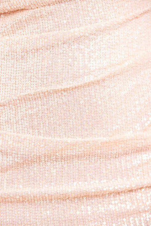 NEW SEASON. The Josephine Long Sleeve Gown in Oyster. Capturing the collection’s celestial shimmer, as if bathed in moonlight. Thousands of sequins are delicately stitched onto stretch mesh, creating a glittering surface that shifts with movement, like starlight scattered across water. The fluid hemline and powermesh sleeves balance sparkle with softness, while the oyster tone offers timeless refinement. A gown that feels both modern and eternal.