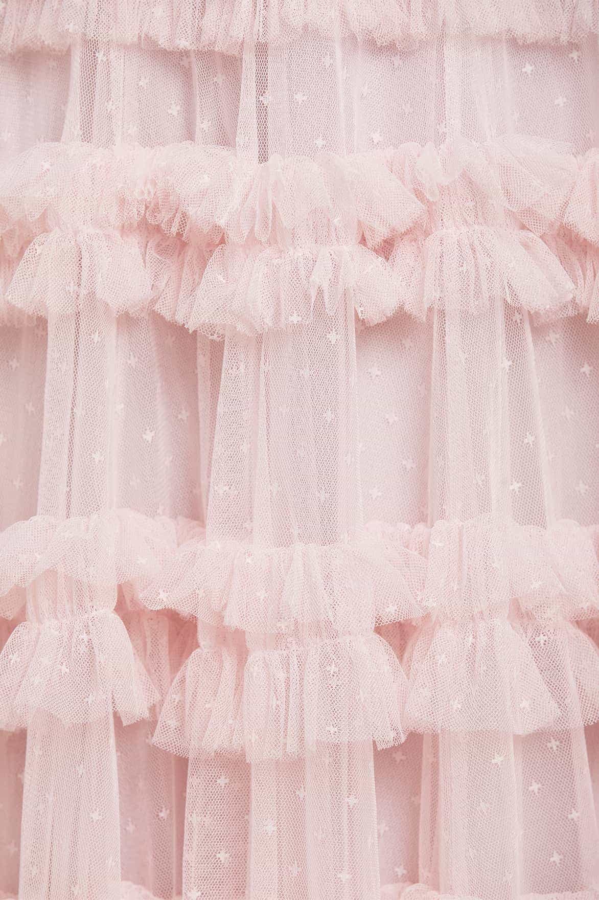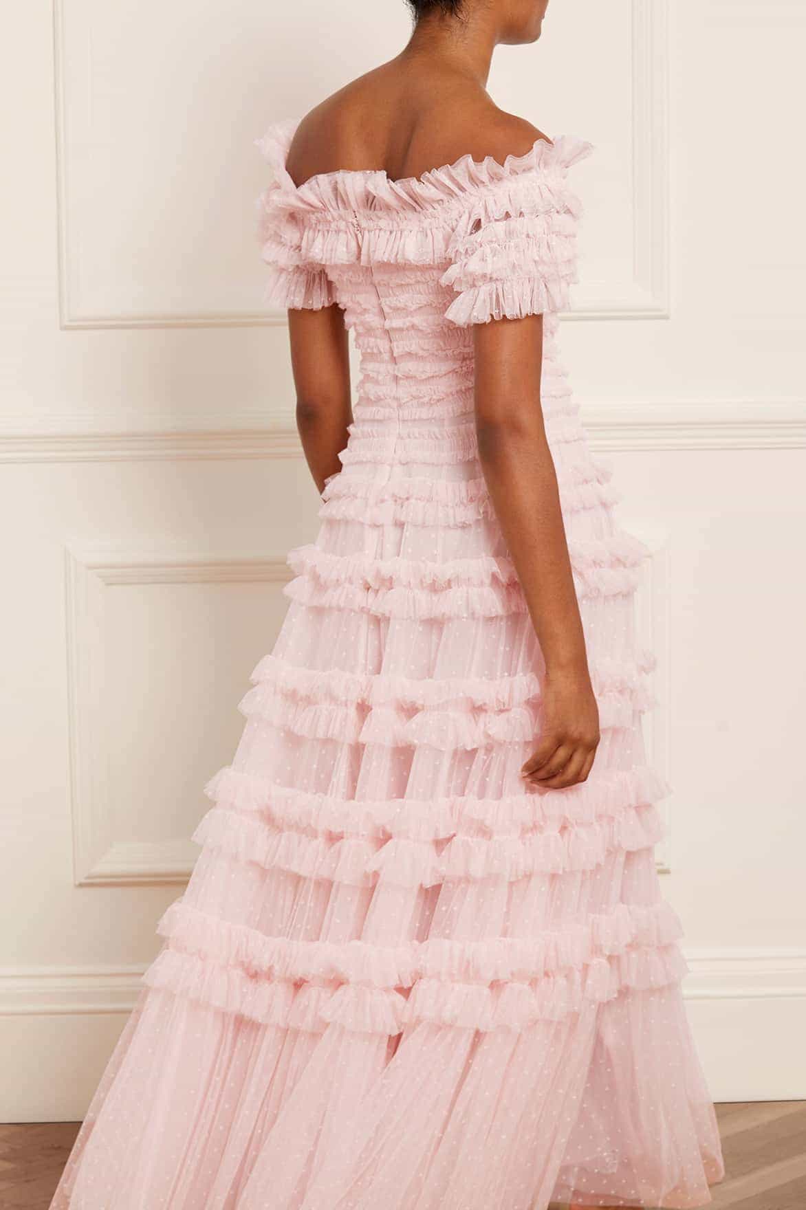 The Lisette Ruffle Off Shoulder Gown in Peony Pink. This statement gown has an elegant off-the-shoulder design inspired by Hollywood styling. Crafted with textile tulle and double-stitched frills for a dramatic, romantic effect. Features an integrated corset for a perfect fit and to hold the silhouette. Expect all eyes on you in this romantic gown.