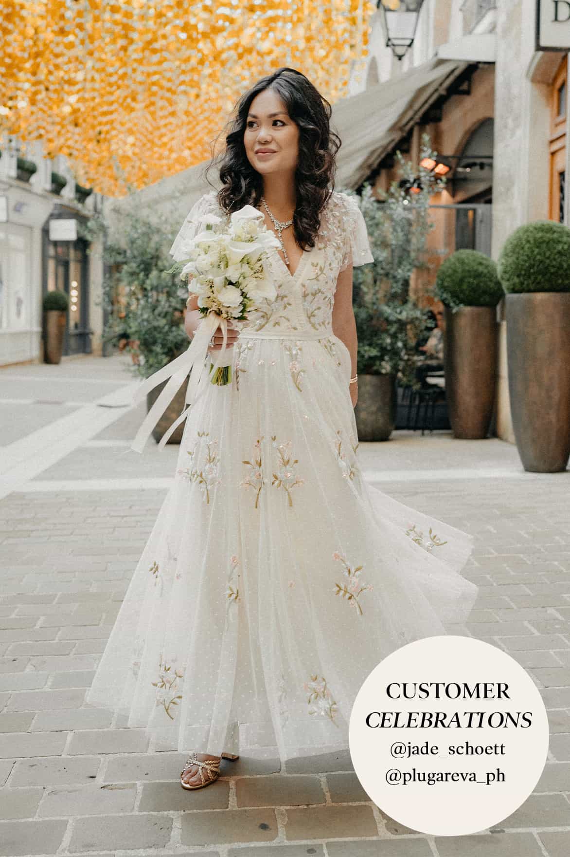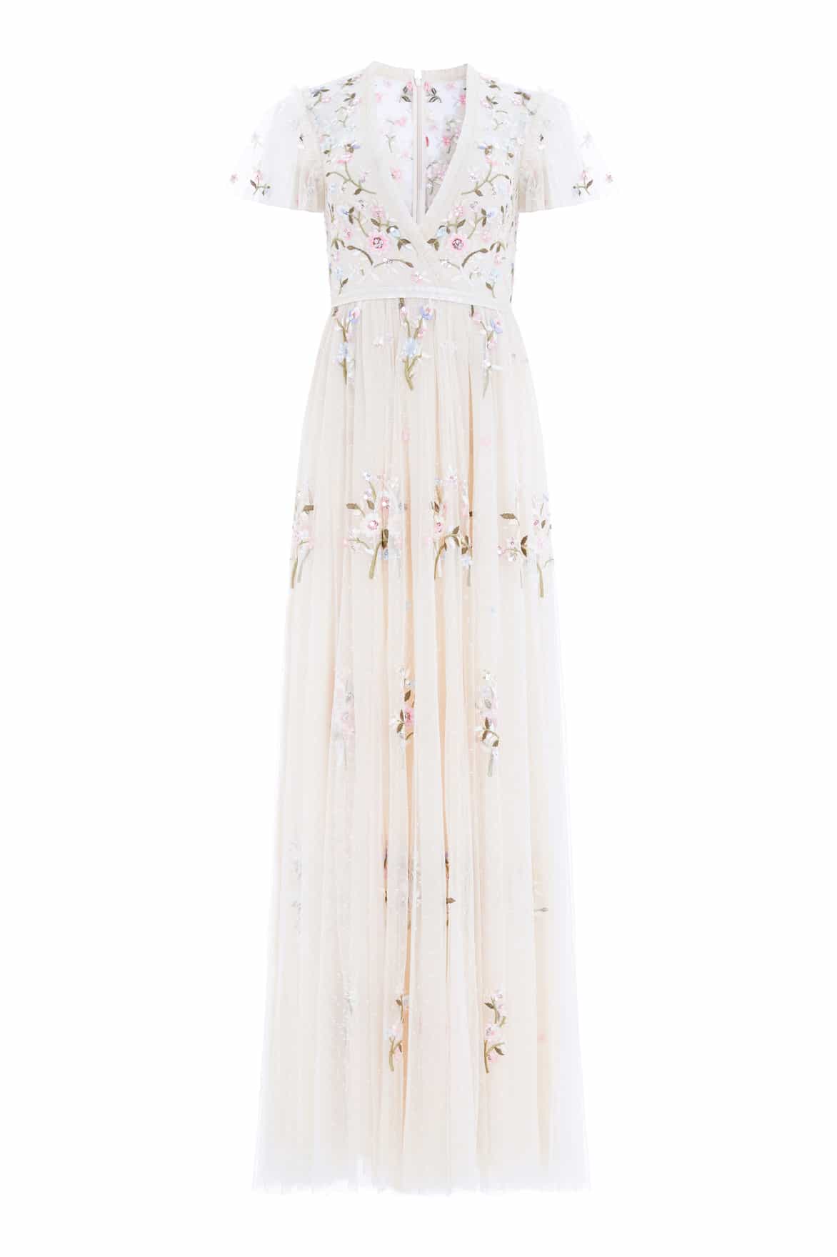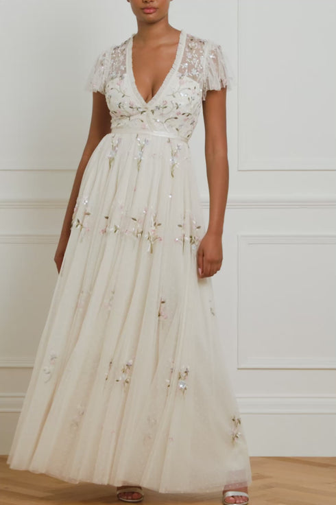The Petunia Cap Sleeve Gown in Cream. Inspired by Edwardian vintage artwork, this elegant gown is designed with rich embroidered bouquets of delicate florals in soft, pastel shades and subtle, vibrant green highlights. Shimmering iridescent sequins scattered throughout add a glistening effect to the piece. Intricately cut with fine, delicate tulle ruffles trimming the neckline and a voluminous skirt that features a net under layer to hold the shape and create a romantic silhouette. The ultimate fairytale style.
