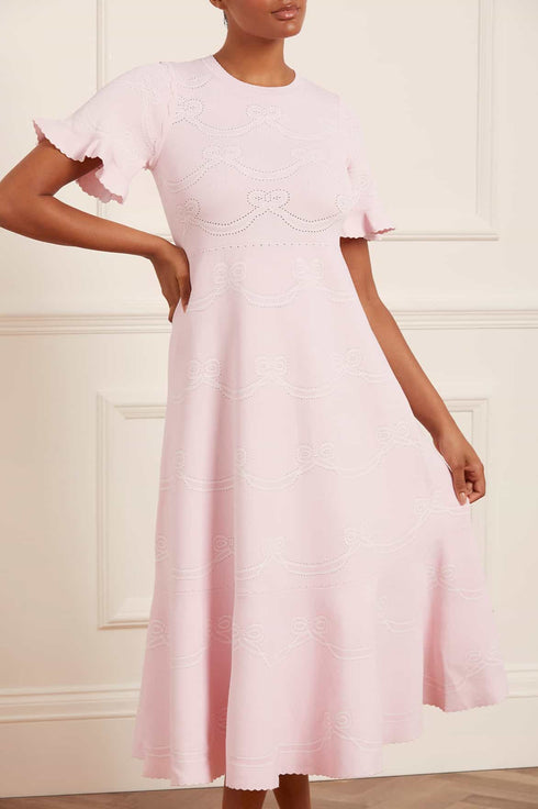 The Ribbon Bow Knit Ankle Gown in Pink / White. This gown is beautifully engineered with ribbon bow motifs creating a pretty and feminine design. Developed from a recycled viscose fabric for a flattering and comfortable fit. Designed with a delicate jacquard pattern framed with pointelle and scallop details. Crafted with a stretch bodice, round neckline and fluted cuffs for signature Needle & Thread elements. Make this gown your new favourite wardrobe staple.
