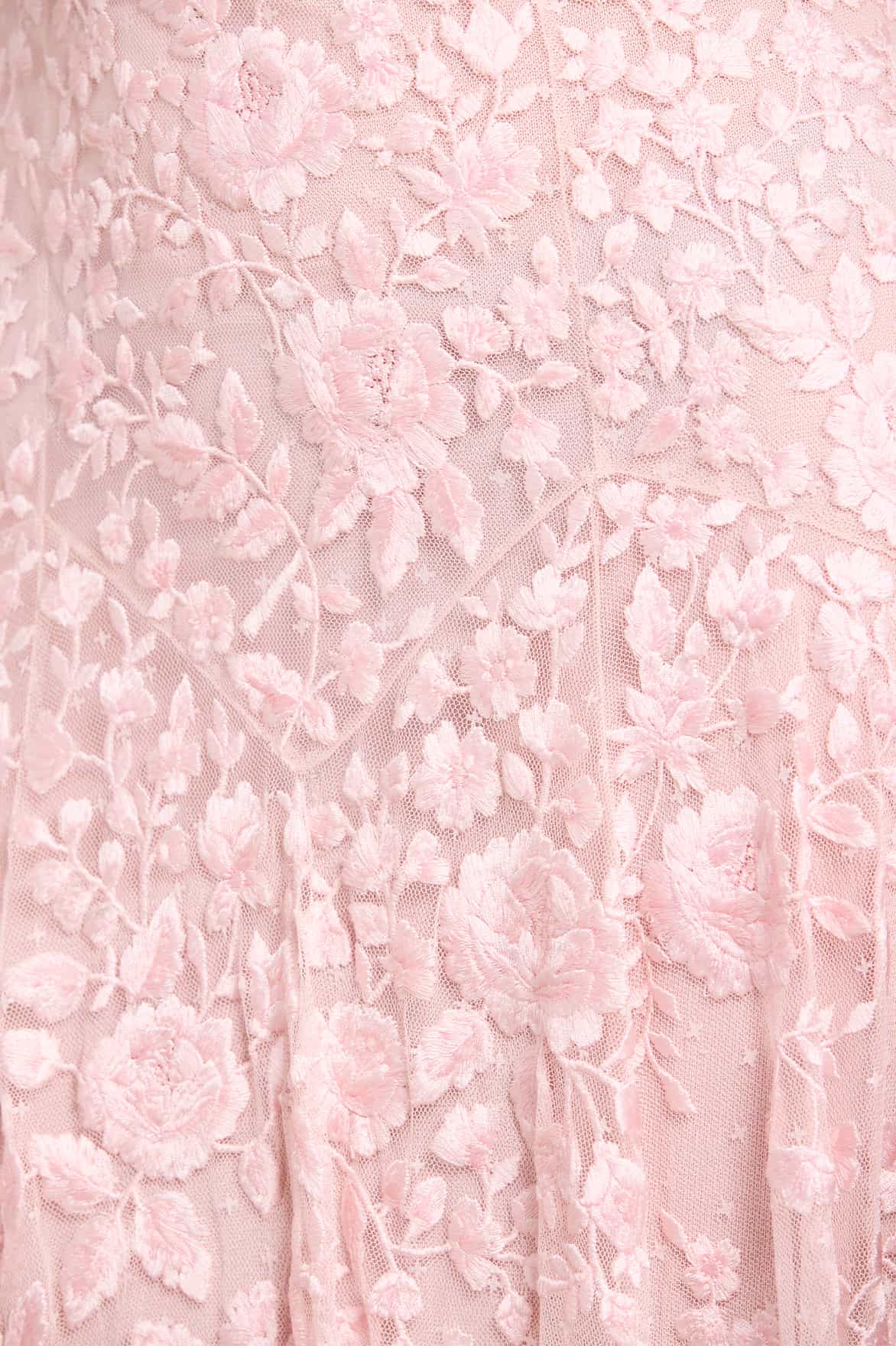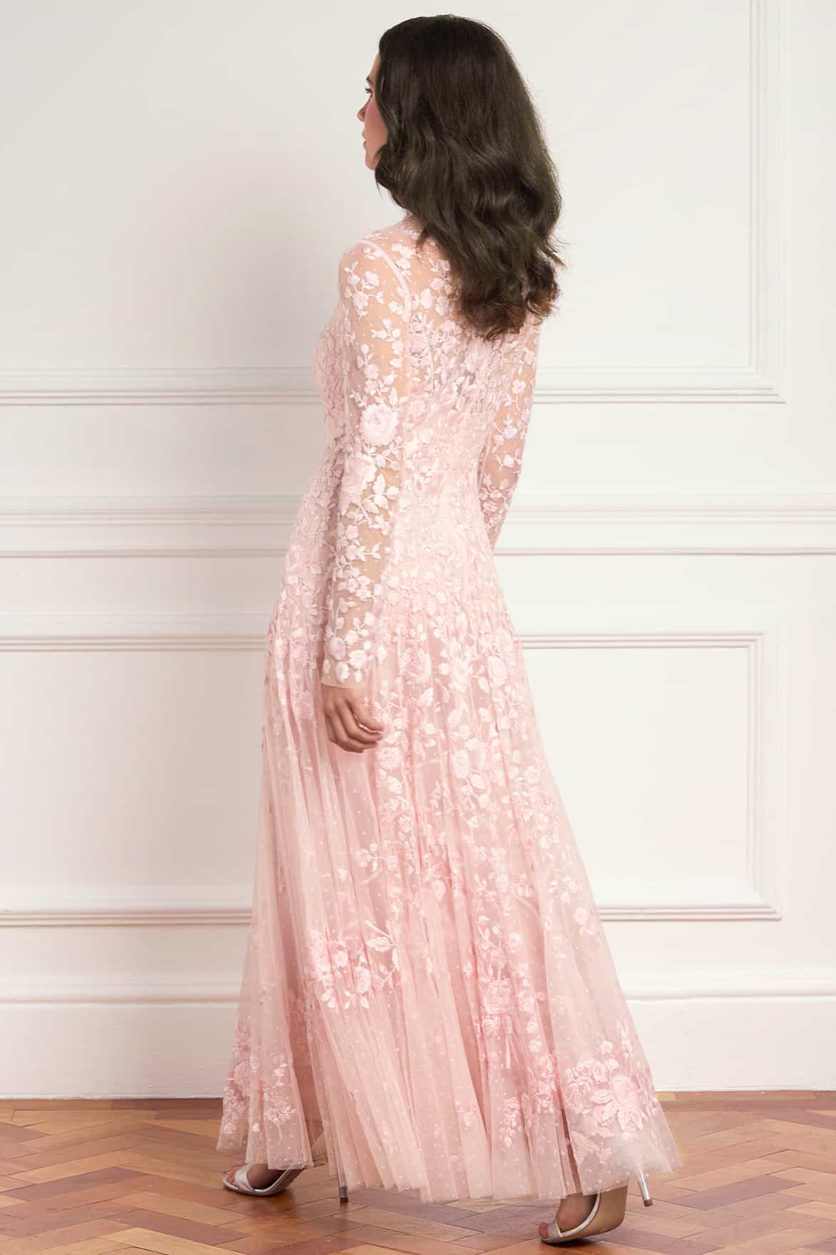 NEW SEASON. The Rosa Round Neck Ankle Gown in Peony Pink. This romantic gown is adorned with signature floral embroidery inspired by painted English gardens. Finished with a round neckline and flowing ankle-length silhouette for effortless elegance.