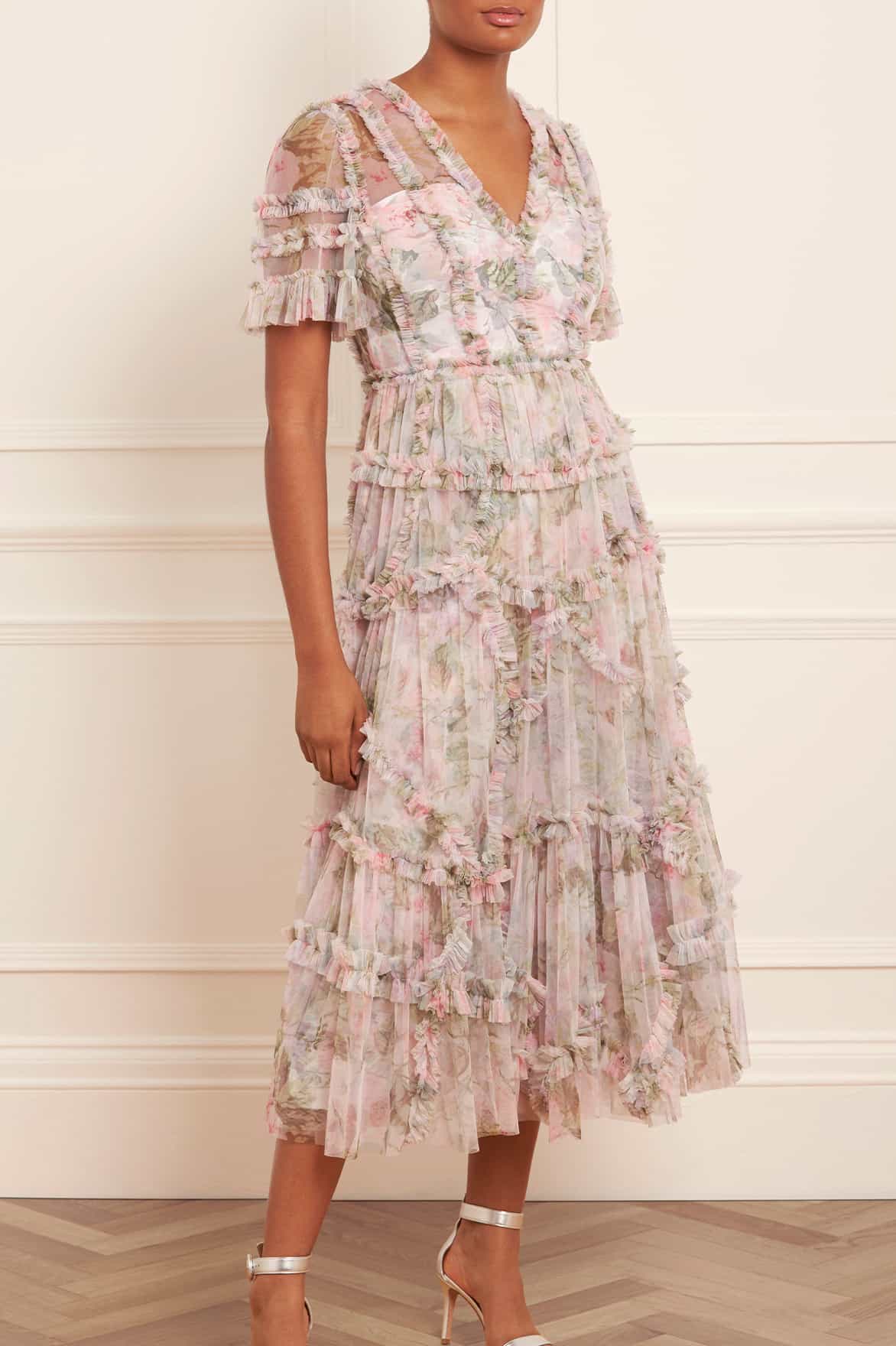 The Rose Powder Ruffle Ballerina Dress in Moonshine. This dress is inspired by a 1900s hand-painted wallpaper design. Beautifully printed with florals in faded pastels for a vintage look. This dress is crafted with signature Needle & Thread styling featuring tulle ruffles and layers of delicate tulle, creating pretty, effortless movement. A wardrobe treasure you'll forever hold onto.