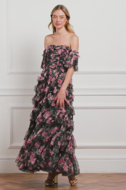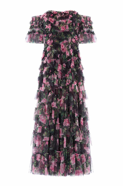 NEW SEASON. The Rose Vine Aviana Off-Shoulder Gown in Graphite. Blending the sculptural tulle frills of Needle & Thread’s signature Aviana silhouette with embroidered rose vines, drawn from 19th-century prints. Rows of scallop frills add texture and volume, while the off-shoulder neckline frames the décolletage. The trailing rose embroidery softens the silhouette, this gown captures the mystery and grandeur of the Bright Star collection.