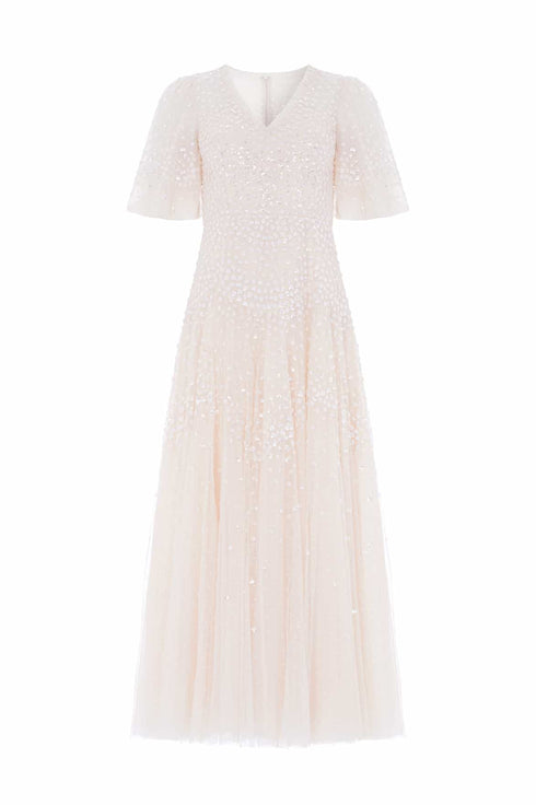 NEW SEASON. The Scallop Sequin V-Neck Ankle Gown in Cream. Decorated with glistening sequin clusters that gently fade toward the hem. Designed with a flattering V-neckline and flowing silhouette, this gown radiates elegance and soft luminosity.
