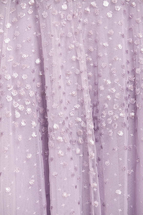NEW SEASON. The Scallop Sequin V-Neck Ankle Gown in Lavender. Features luminous sequins cascading across soft tulle. Designed with a flattering V-neckline and flowing silhouette, this gown radiates understated elegance.