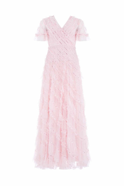 The Spiral Sequin V-Neck Ankle Gown in Peony Pink. A brand new style for the season ahead. This gown is a true statement piece, featuring all over frothy texture to create a signature Needle & Thread look. Beautifully engineered with gathered, spiral texture and intricate, shimmering sequins adorning each individual frill creating an enchanting effect. Make an appearance in this romantic style.