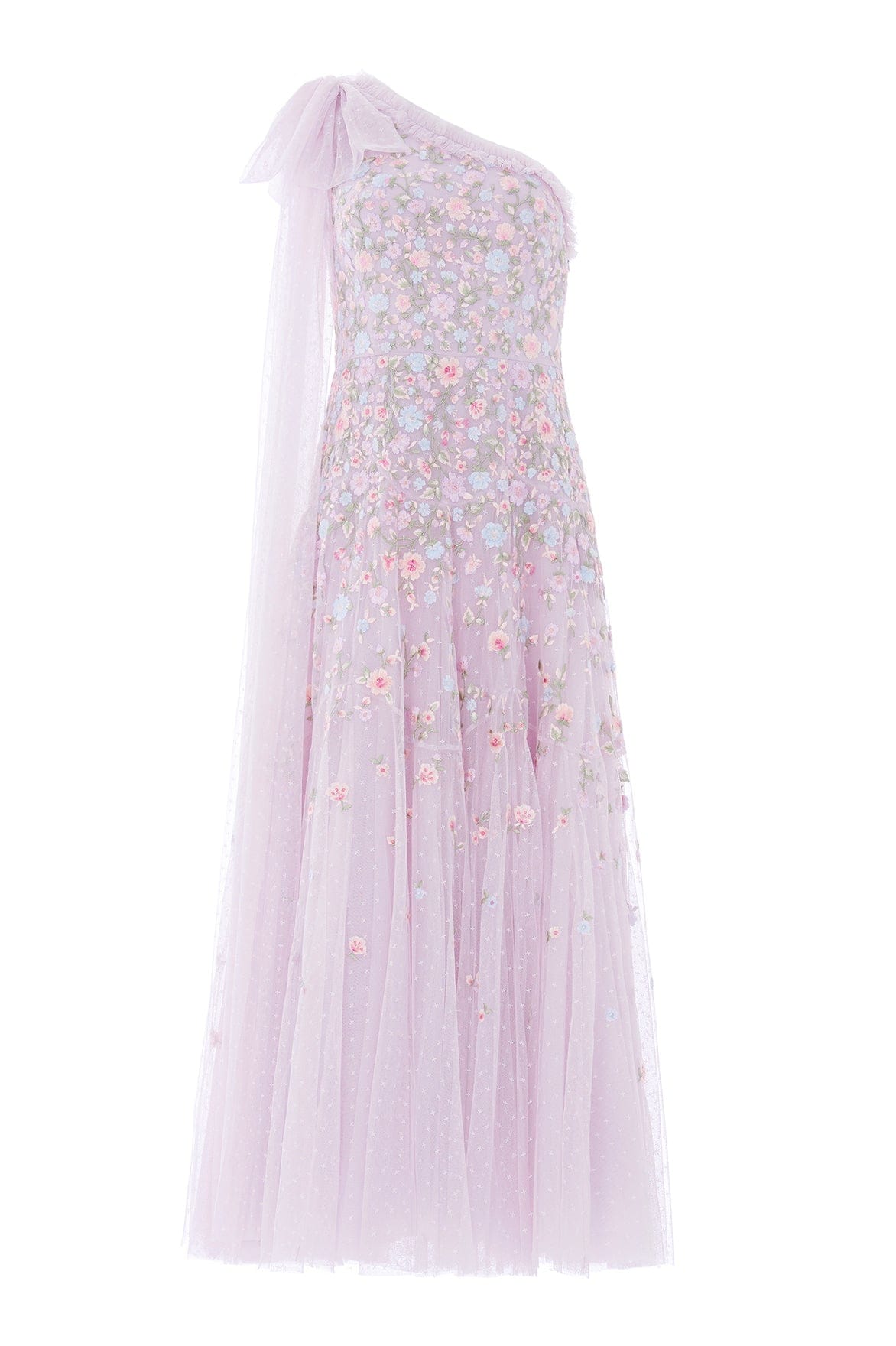 NEW SEASON. The Sylvia Rose One-Shoulder Bow Ankle Gown in Powder Lilac/Bright. This romantic gown features delicate floral embroidery arranged in softly graduated bands across the silhouette. Finished with a striking one-shoulder neckline and bow detail for an elegant statement.