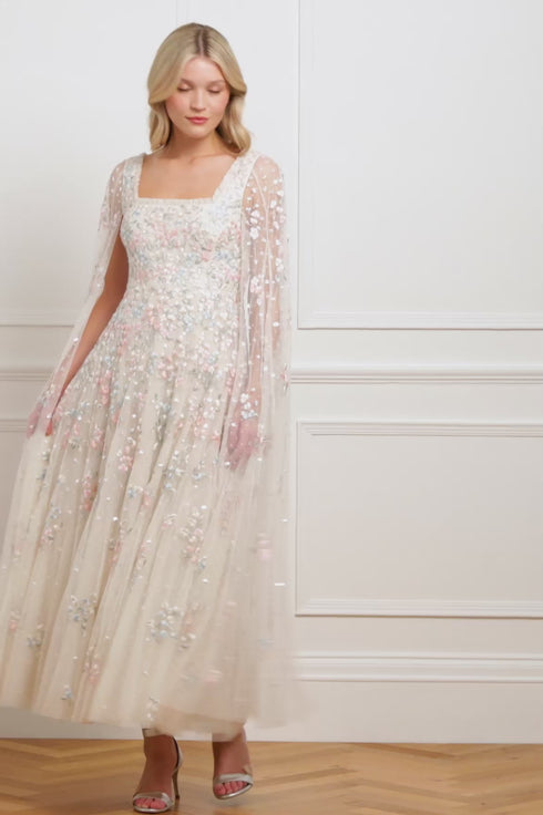 The Versailles Ditsy Cape Sleeve Ankle Gown in Cream. Inspired by the opulence of Versailles, this gown features rich multicoloured floral embroidery across the bodice, trailing softly toward the hem. Decorated with high-shine sequin dot motifs add a touch of shimmer throughout. A square neckline trimmed with signature tulle frills and delicate embroidered cape sleeves enhance its romantic charm. Finished with a sweeping layered tulle skirt, this piece exudes elegance and grandeur.