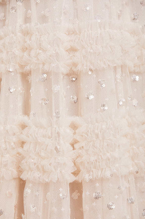 The Vivian V-Neck Micro Mini Dress in Cream. A signature Needle & Thread style statement. Beautifully printed with sequin polka dot motifs scattered throughout, creating an enchanting shimmer. Adorned with specially sourced sequins to create a sparkling effect throughout. This romantic style features tulle frills in perfectly positioned rows, creating a soft, frothy texture. Developed with generous ruffled sleeves and a V-neckline for a contemporary look. A style you'll wear time and time again.