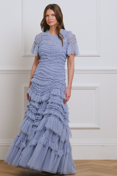 The Wild Rose Short Sleeve Gown in Sky Blue features layers of ruffled tulle and intricate frill tiers, creating a breathtaking, voluminous silhouette. The net tulle skirt adds flattering fullness, making this show-stopping gown perfect for turning heads at any occasion.