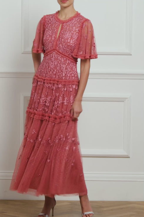 The Autumn Lace Ankle Gown in Autumn Rose. This signature Needle & Thread style is designed with floral motif embroidery inspired by antique lace designs. This gown is developed with romantic fluted sleeves, a gathered tiered hem, and is created from layers of soft tulle to create a flattering silhouette. A classic and contemporary style.