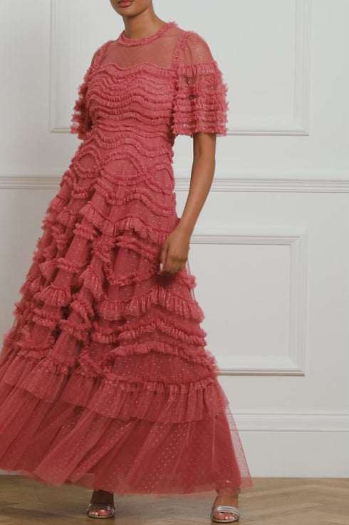 The Bronte Gown in Autumn Rose. This gown features an exquisite textile meticulously developed in 3D by the designer, directly onto the mannequin. Beautifully developed with romantic, frothy frills arranged in intricate scallops and oval designs that gracefully adorn the bodice and skirt. Designed with short fluted sleeves and delicate tulle ruffles that mirror the gown's intricate detailing. The silhouette is exceptionally flattering, with a fitted bodice that flows into a generous skirt made up of layers of net and tulle, culminating in a sweeping hemline that ensures a breathtaking entrance.