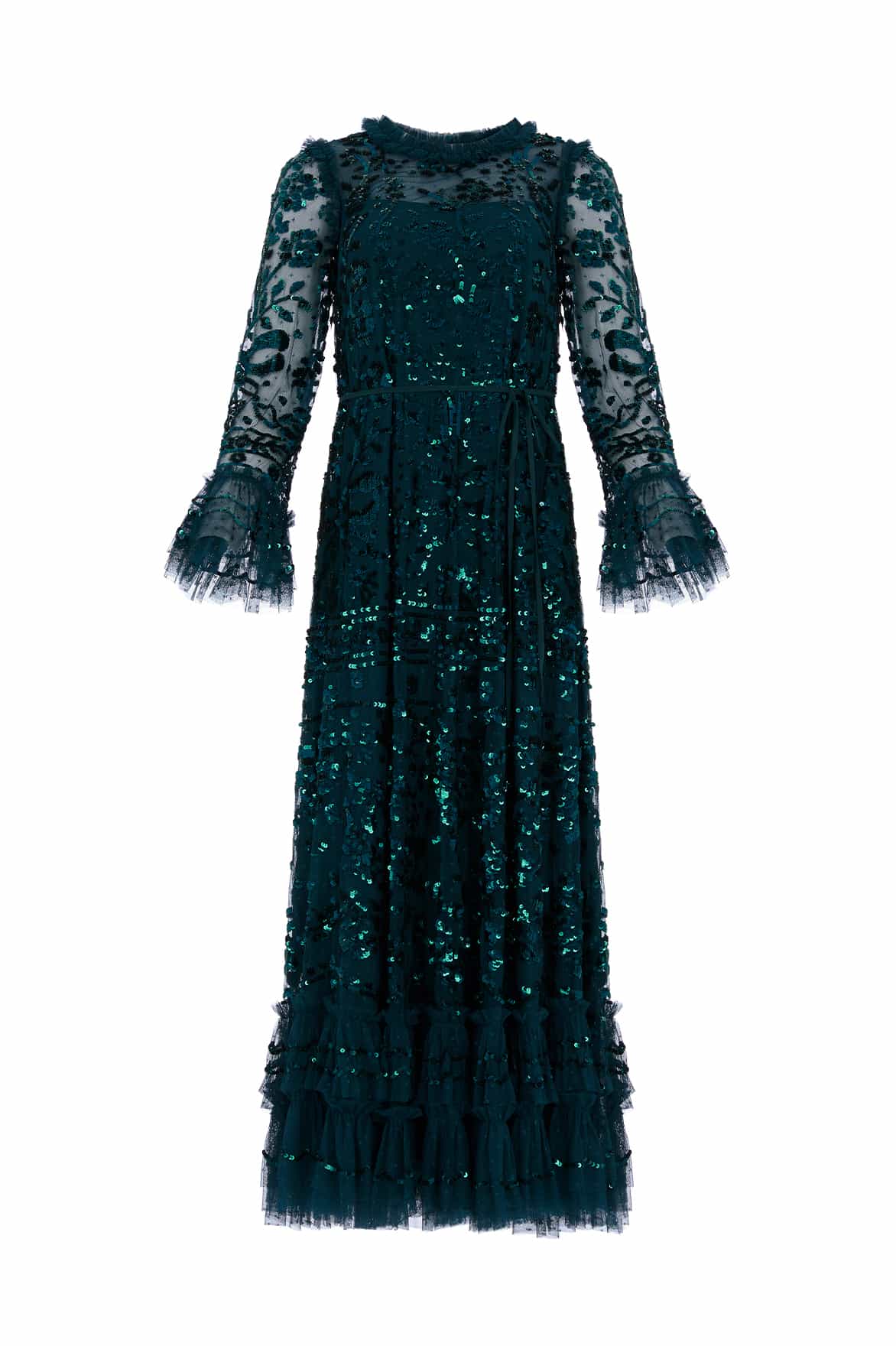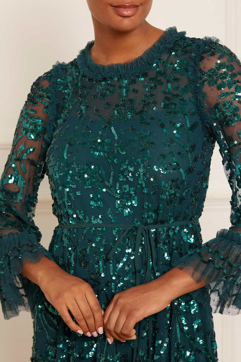 The Celia Long Sleeve Ankle Gown in Emerald. This statement gown is designed with romantic artwork featuring ornate florals and ribbon bows, densely embellished with shimmering sequins for exquisite detailing. Designed with an effortless loose fit with soft, playful tulle frills on the hem and cuffs. A key piece in our collection.