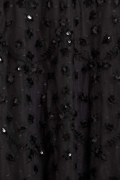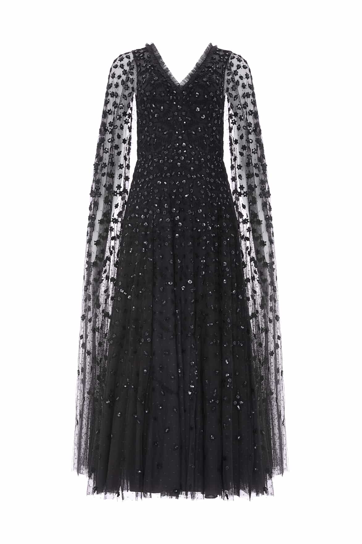 The Clover Cape Sleeve Ankle Gown in Graphite. A romantic silhouette inspired by vintage lace designs from the early 1900s. Adorned with delicately embroidered ditsy florals and scalloped foliage motifs, the gown features soft cape sleeves for an ethereal touch. The embroidery gradually widens toward the hem, dissolving into swirling floral patterns for a soft, whimsical finish. A perfect choice for seasonal events and graceful occasions.