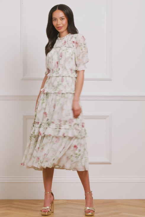 NEW SEASON | NEEDLE & THREAD EXCLUSIVE. The Colette’s Rose Emilia Georgette Ballerina Dress in Moonshine. This beautiful look captures the essence of vintage femininity. This mid-length dress features the heritage-inspired Colette’s Rose floral print, softly arranged across airy georgette panels. A charming choice for any occasion.