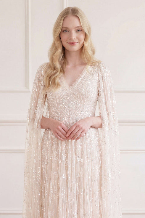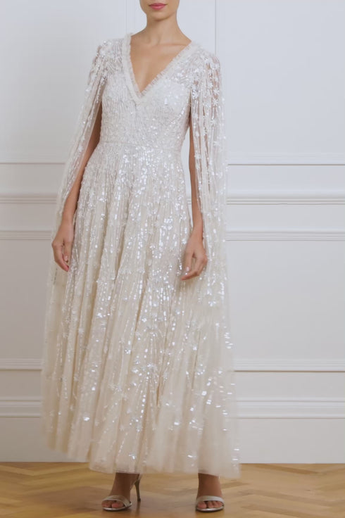 NEEDLE & THREAD EXCLUSIVE. The Comet Ankle Gown in Cream. This beautiful statement piece showcases glittering sequin shooting star motifs, inspired by the night sky, with embellishments that delicately trail down to the hem. This gown features our new floor-length cape, adding an element of romantic elegance. The skirt is crafted from layers of net and tulle, creating a full, voluminous silhouette. The sequins have a special high-shine, gloss finish created from extra foil coating added to each sequin to create this extra lustrous look. Make a memorable appearance in the Comet Ankle Gown.