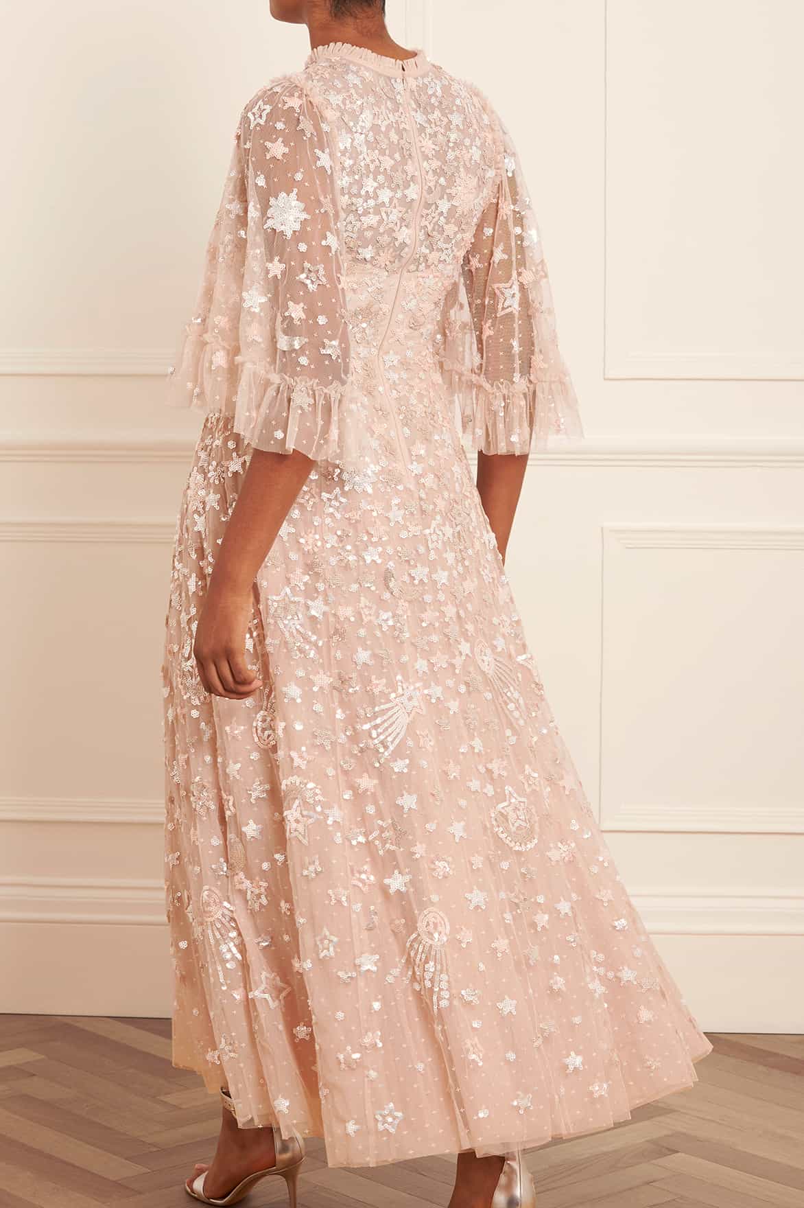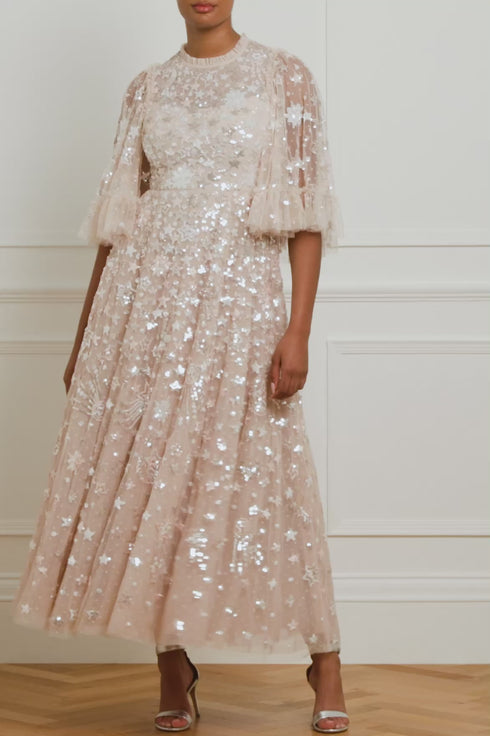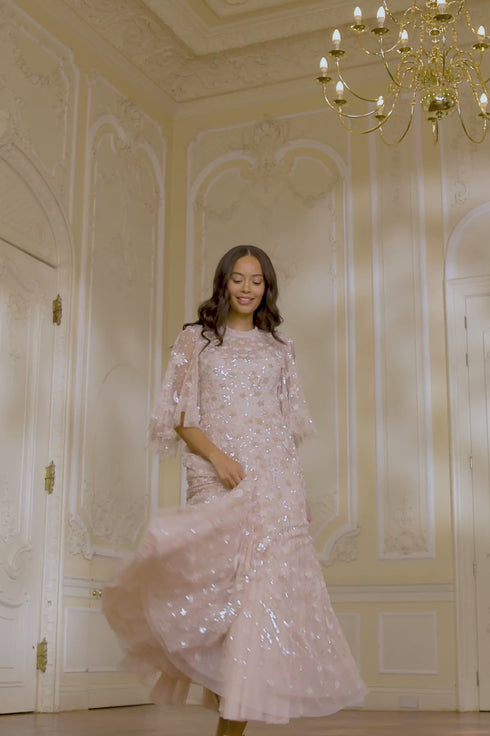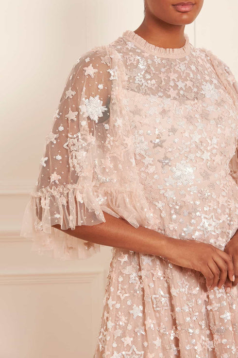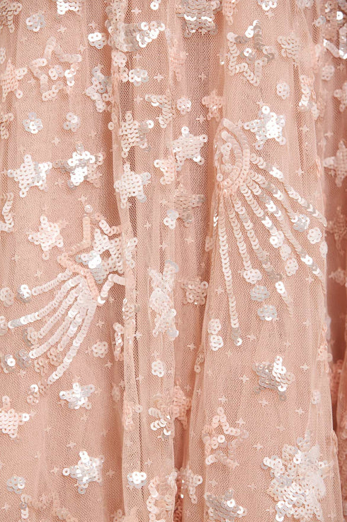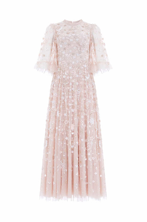 The Constellation Gloss Ankle Gown in Pebble. This gown is decorated with an intricate sequin artwork inspired by the night sky, while the loose, trapeze-shaped silhouette is adorned with crescent moons, shooting stars, and constellations for a charming all-over embellishment. Beautifully developed with high-shine sequins, tiered tulle frills and voluminous sleeves for a statement look. Wear with minimal accessories and let this style speak for itself.