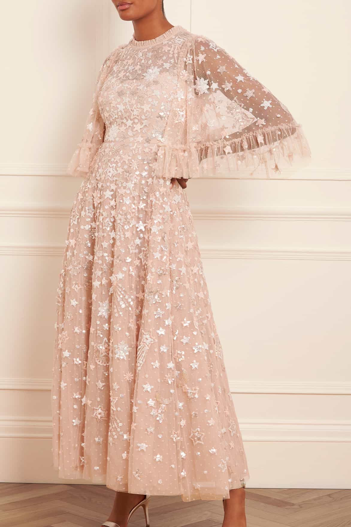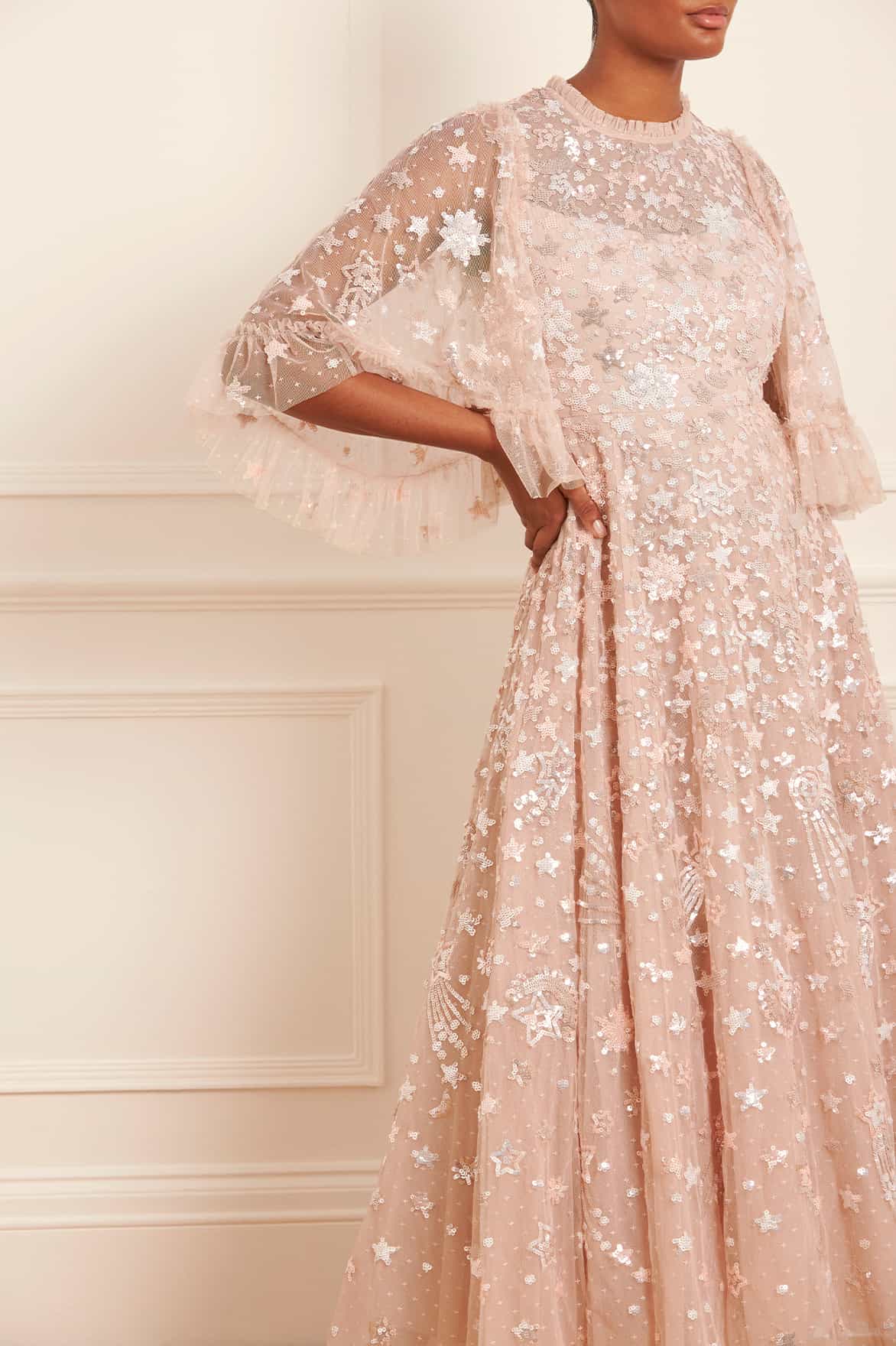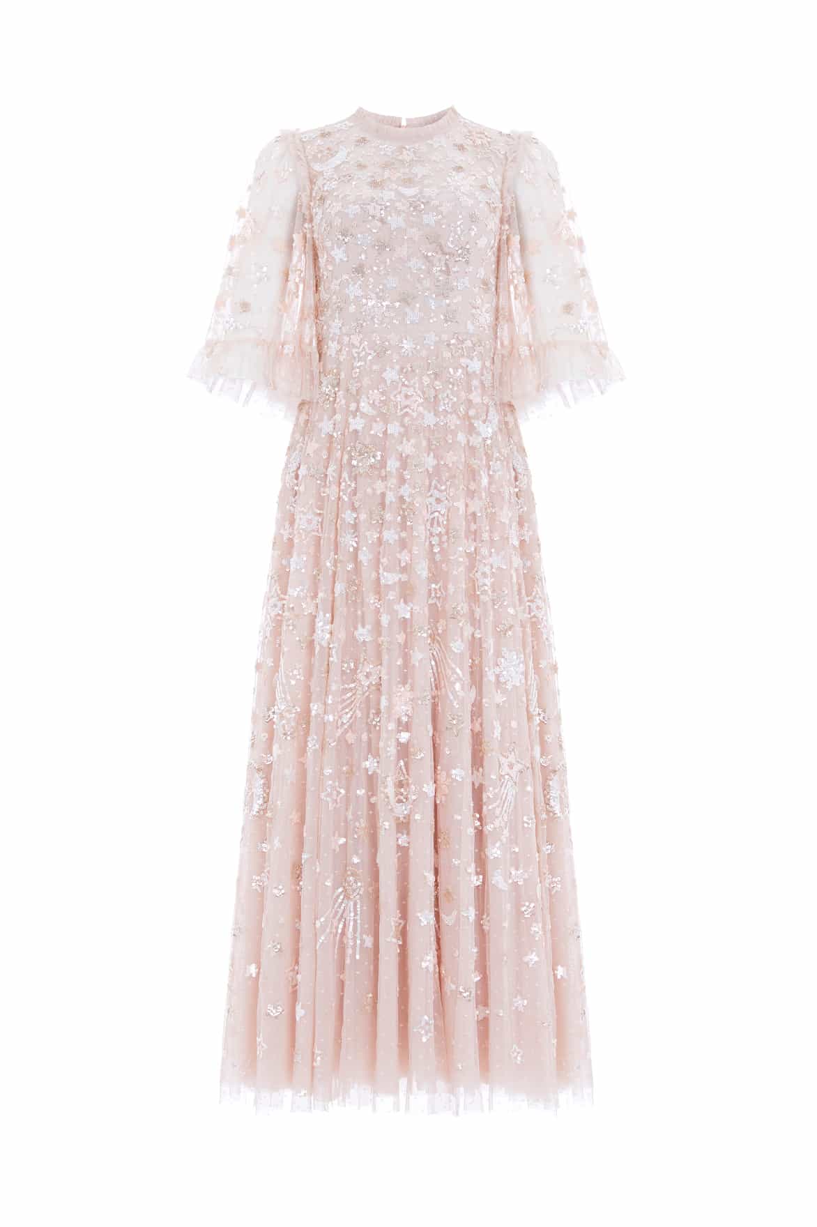 The Constellation Gloss Ankle Gown in Pebble. This gown is decorated with an intricate sequin artwork inspired by the night sky, while the loose, trapeze-shaped silhouette is adorned with crescent moons, shooting stars, and constellations for a charming all-over embellishment. Beautifully developed with high-shine sequins, tiered tulle frills and voluminous sleeves for a statement look. Wear with minimal accessories and let this style speak for itself.