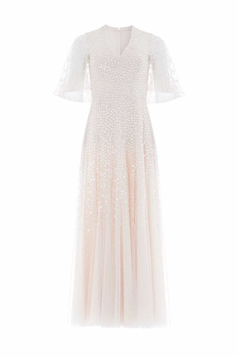 NEW SEASON | NEEDLE & THREAD EXCLUSIVE. The Dappled Sequin Cape Ankle Gown in Cream. A graceful romantic design, this ethereal gown features an integrated cape with softly gathered frill detailing, adding fluid movement and a touch of drama. Crafted with delicate clusters of shimmering sequins intricately scattered across the fabric, creating a light-catching, dappled effect. Designed with signature Needle & Thread tulle ruffles framing the neckline, while chevron seaming sculpts the waist and hips before falling into a voluminous, frothy skirt. Crafted from generous layers of net and tulle, this gown is destined for truly unforgettable moments.