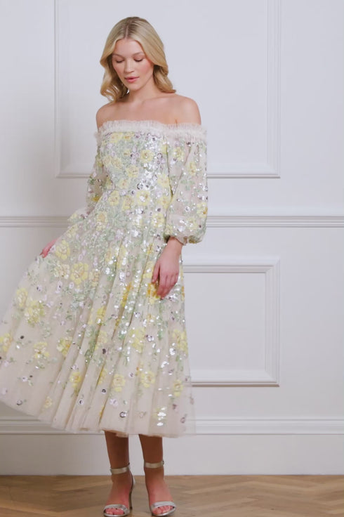 The Elina Rose Off-Shoulder Ballerina Dress in Cream. This ballerina dress showcases exquisite 3D sequin floral embellishments, with a high-shine gloss finish. The off-shoulder silhouette features elasticated arms with soft tulle ruffles and structured tulle sleeves for added elegance. The skirt flows in layers of net and tulle, culminating in a sweeping hemline. An internal corset with stretch power-mesh ensures a flawless fit and comfort, while soft boning, encased in delicate grosgrain ribbon, adds a touch of couture refinement. The corset’s elastic-trimmed edge and adjustable hook-and-eye fastenings provide tailored versatility. A dress that will make you feel effortlessly enchanting.