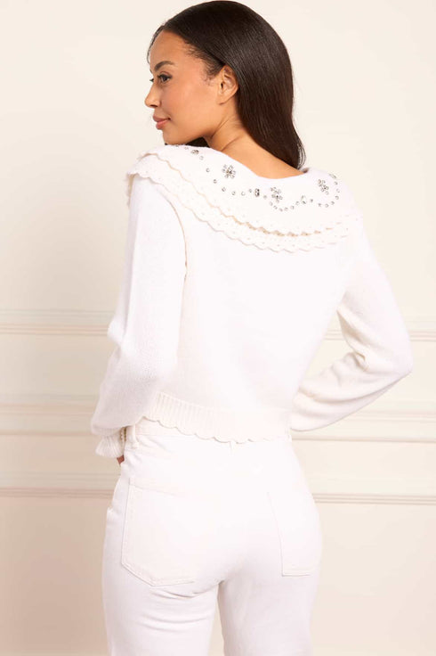 NEW SEASON | NEEDLE & THREAD EXCLUSIVE. The Embellished Collar V-Neck Cardigan in Cream. A refined knitwear piece with an elevated twist. Crafted from soft yarn and finished with a delicately embroidered collar, this cardigan adds a romantic touch to everyday looks. Wear buttoned up with the Ballet Kisses Ankle Skirt, or layer over a dress for a feminine contrast.