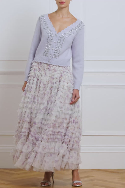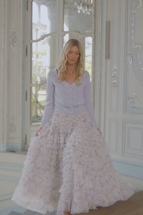 The Embellished V-Neck Short Cardigan in Pale Blue. This cardigan features a glittering embellishment inspired by delicate vintage lace. The neckline is adorned with crystal gems for romantic styling. Developed in soft merino wool blended with cashmere for a feminine texture, this cardigan has a short silhouette with slim-fit sleeves and body. Designed with a V-neck, scallop detailing, and jewel buttons for a signature Needle & Thread look.